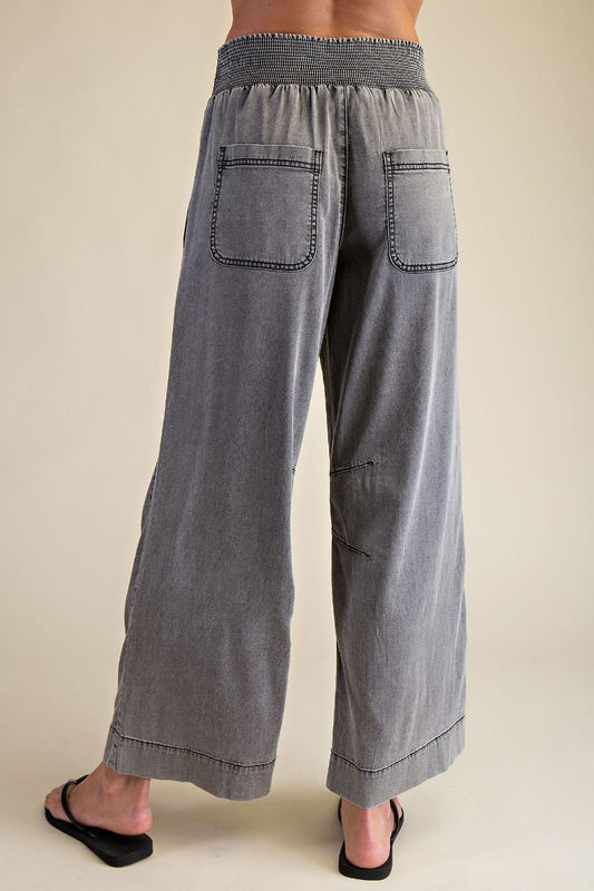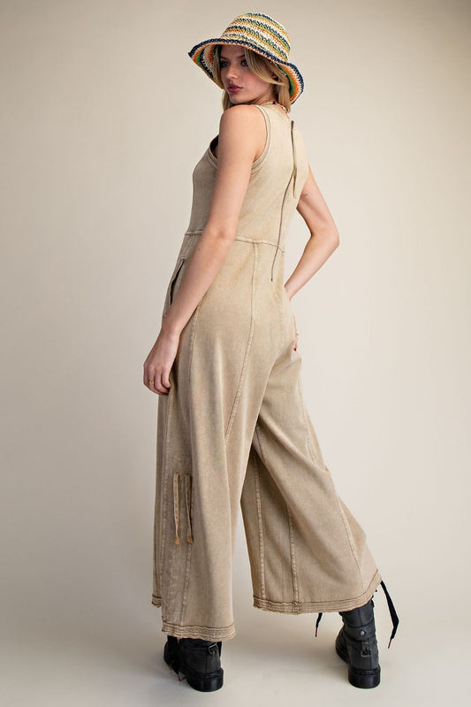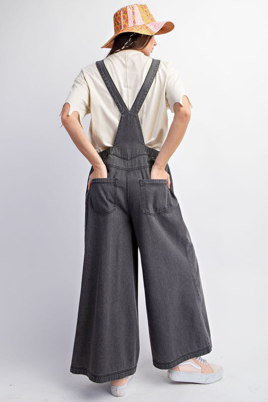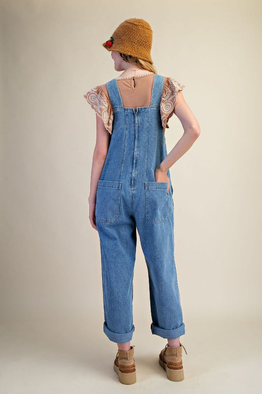 Easel Wide Leg Stone Washed Denim Jumpsuit
