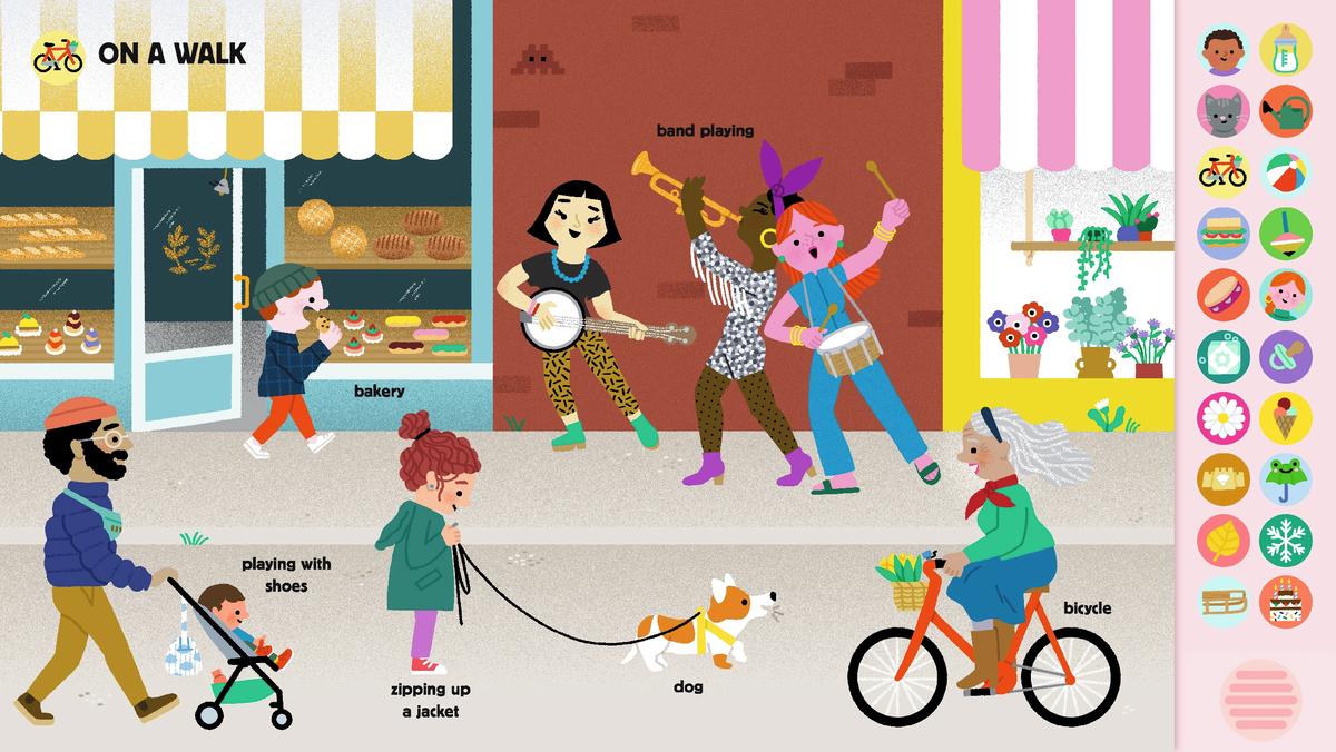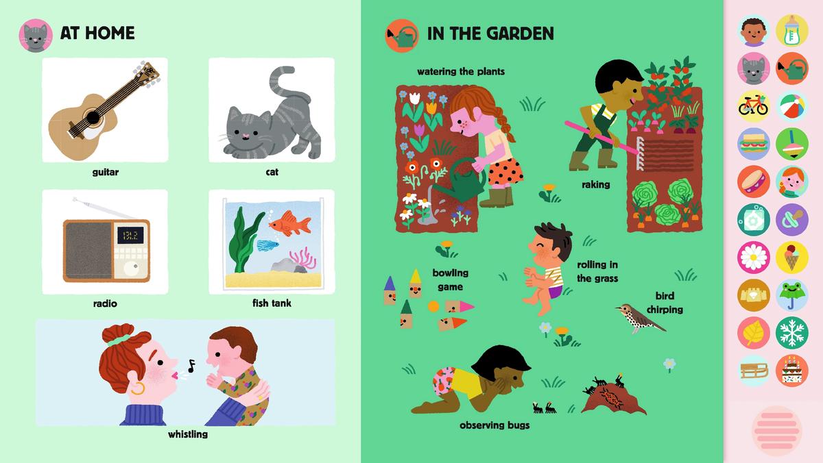 “Good morning!” Kiss kiss! Clapping and laughing… Who or what’s making that sound? Press the buttons to find out! An interactive sound book: Young readers develop important listening skills as they explore sounds and words in their language development. Whether it’s rain falling or a bird singing, children learn to recognize sounds that make them feel good and happy, and that these sounds can be found everywhere and all year round.
