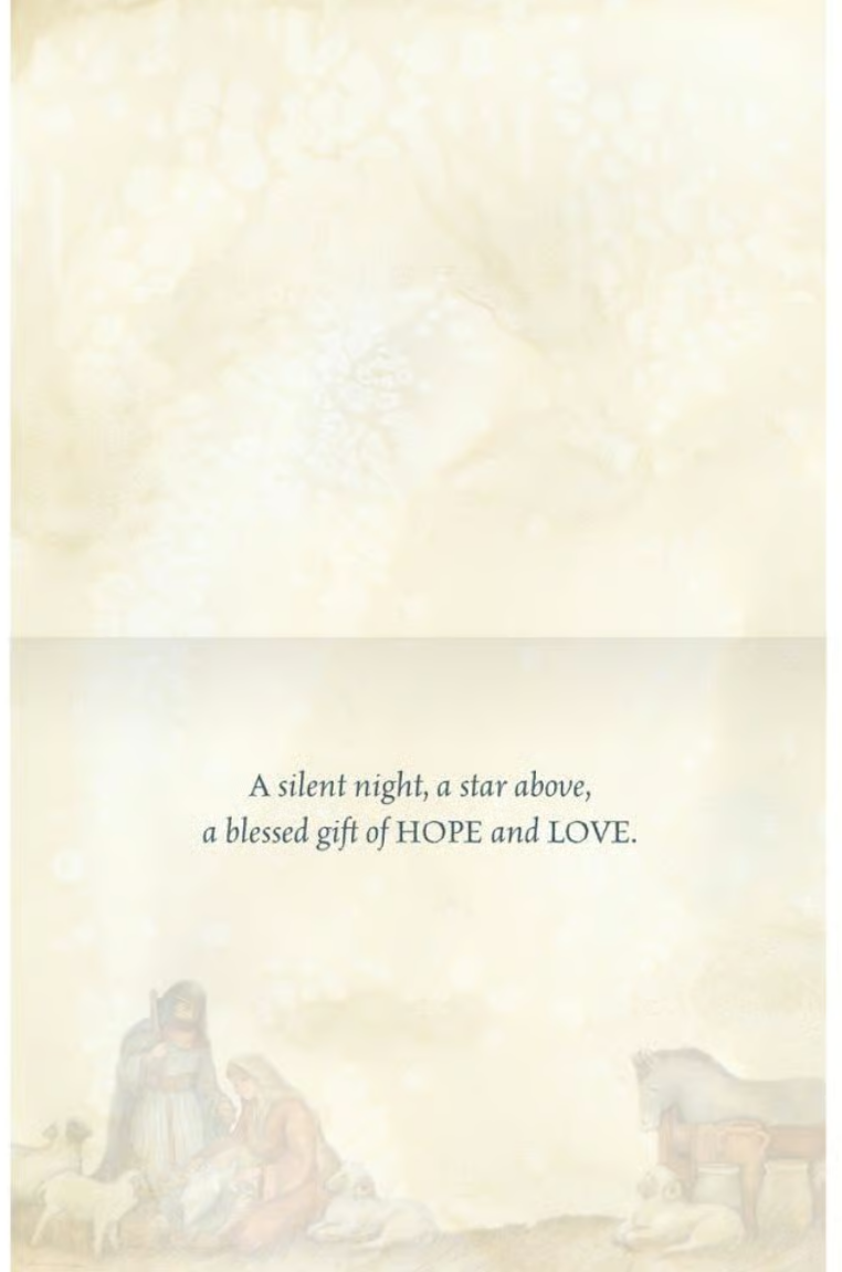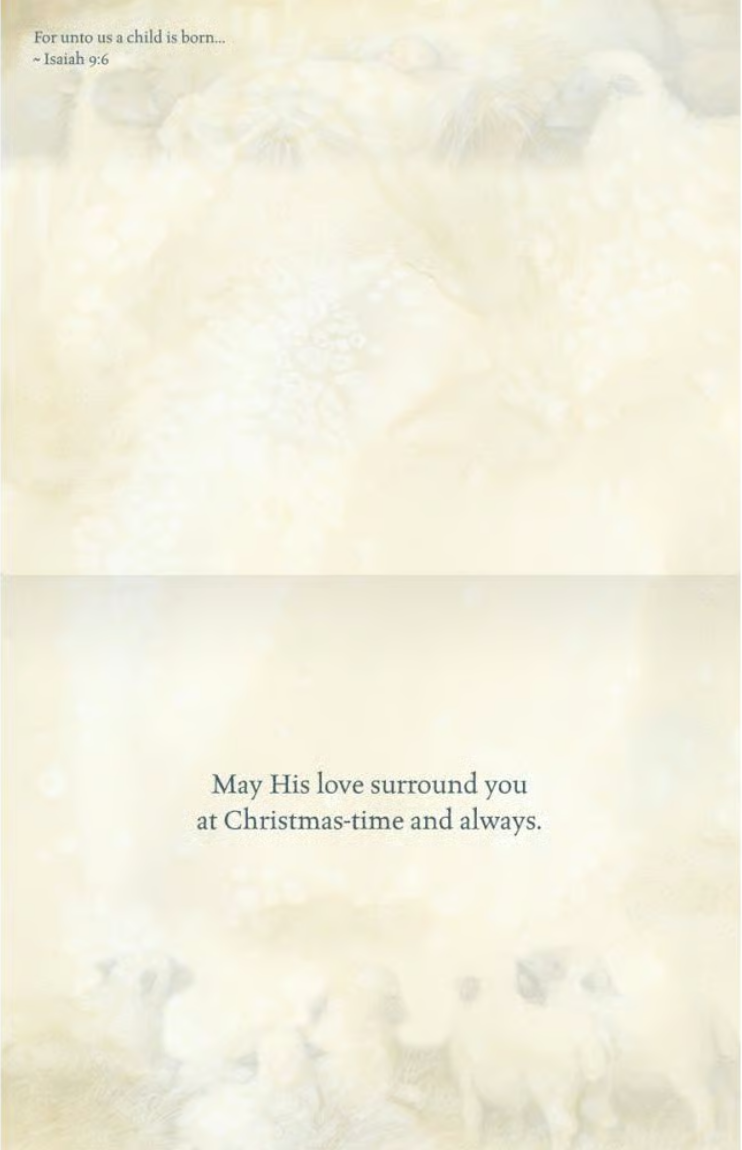 - Inside text: Card 1: For unto us a child is born Isaiah 9:6 May his love surround you at Christmas time and always. Card 2: A silent night, a star above, a blessed gift of hold and love.