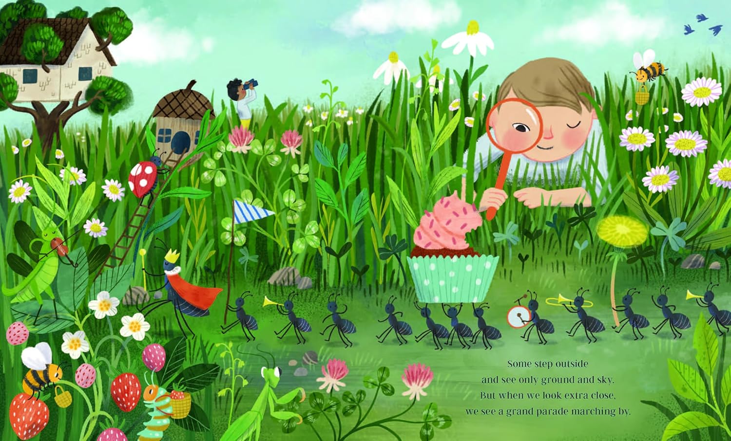 - imagine hidden worlds in which ladybugs live in tiny cabins, snails journey through mushroom fields, and stars paint stories across the sky; and