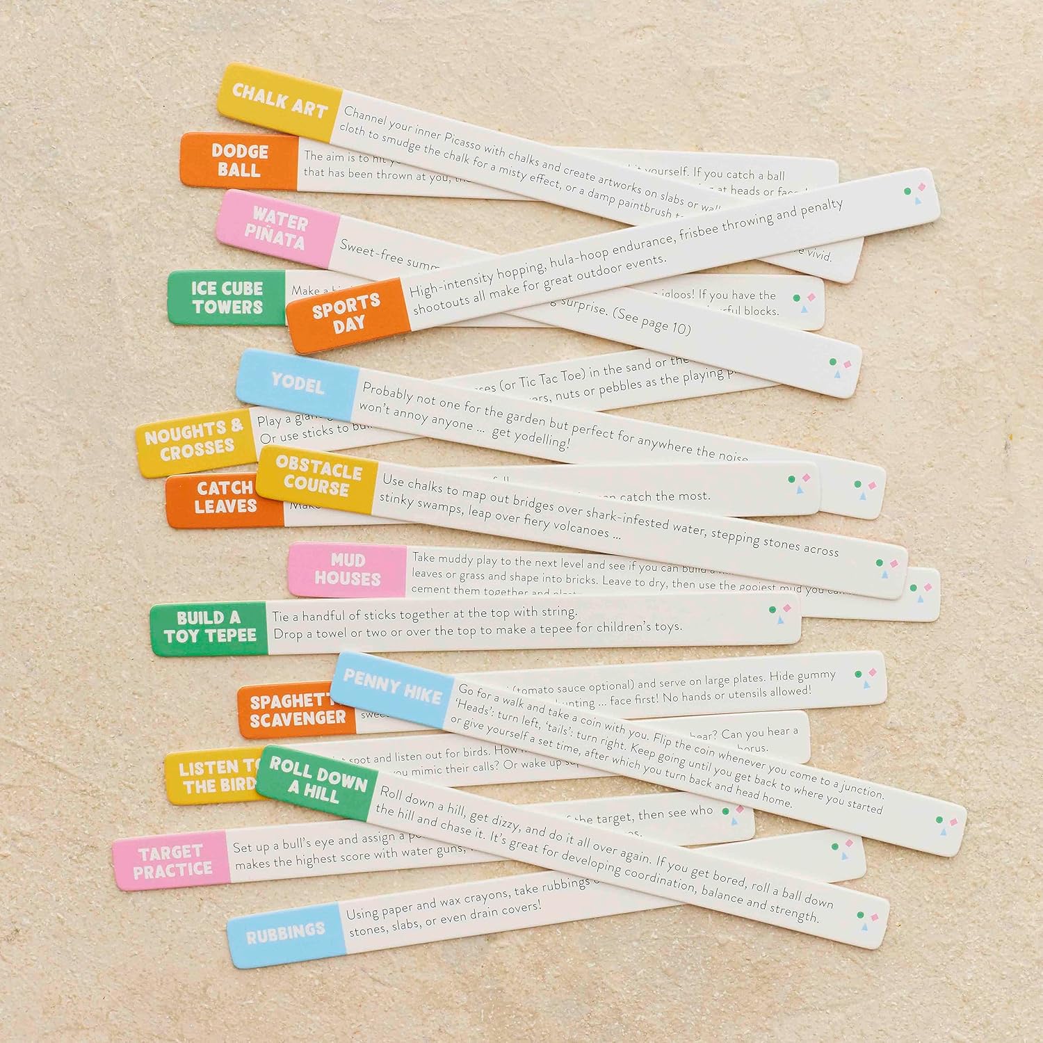 “I’m bored” must be the most frightening words in a child's vocabulary, and how to keep kids entertained is something that keeps many of us awake at night. 100 Things to Do Outdoors is a collection of games, activities, prompts and projects to keep little and not-so-little ones focused, busy and happy. From simple and silly things to distract them for ten minutes to crafts and experiments to keep them entertained for an afternoon, there's a boredom buster for everyone. Pick a play prompt strip to give you all the inspiration you need whether you're a parent, a grandparent, a childcare worker or simply the one in charge of a child for a day! Not every activity will suit your day - or their mood - so just turn the stick over or choose another one from the pot. If you don't know how to make moon sand, chalk paints or giant bubbles, no problem. There's a handy booklet with all the instructions you'll need for all sorts of projects.