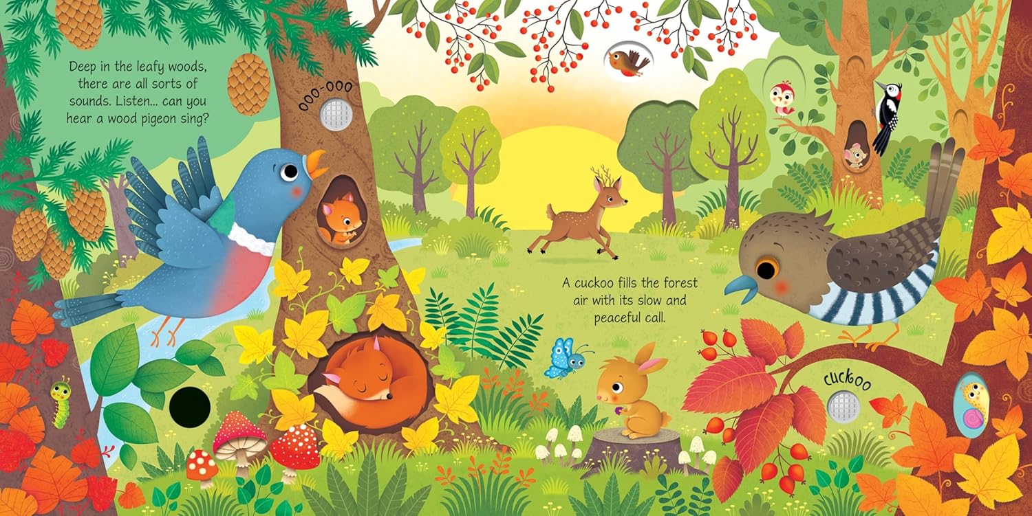 Little children will love hearing the woods come to life as they press the pages of this enchanting book, and hear cuckoos and woodpeckers, rustling leaves and rippling streams. The colourful pages show birds in the treetops, animals playing beside a river and more, with simple text, beautiful illustrations and cut-out shapes to discover.